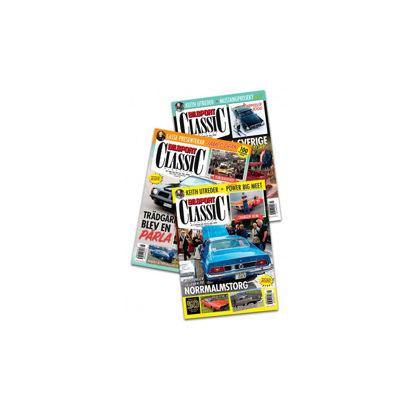 Tidningspaket innehållande alla 10 nummer i artikelserien om Bilsport Classics projektbil Norrmalmstorgsmustangen.